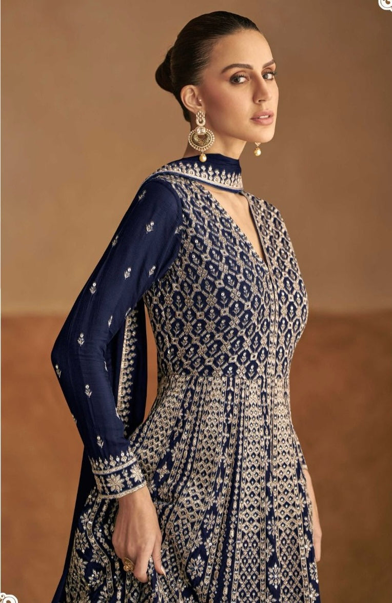 PRE ORDER- DELIVERY TIME IS 2-3 WEEKS Fully stitched top and trousers in sizes 42 and 44. Chinon fabric with thread and zari work with stonework.