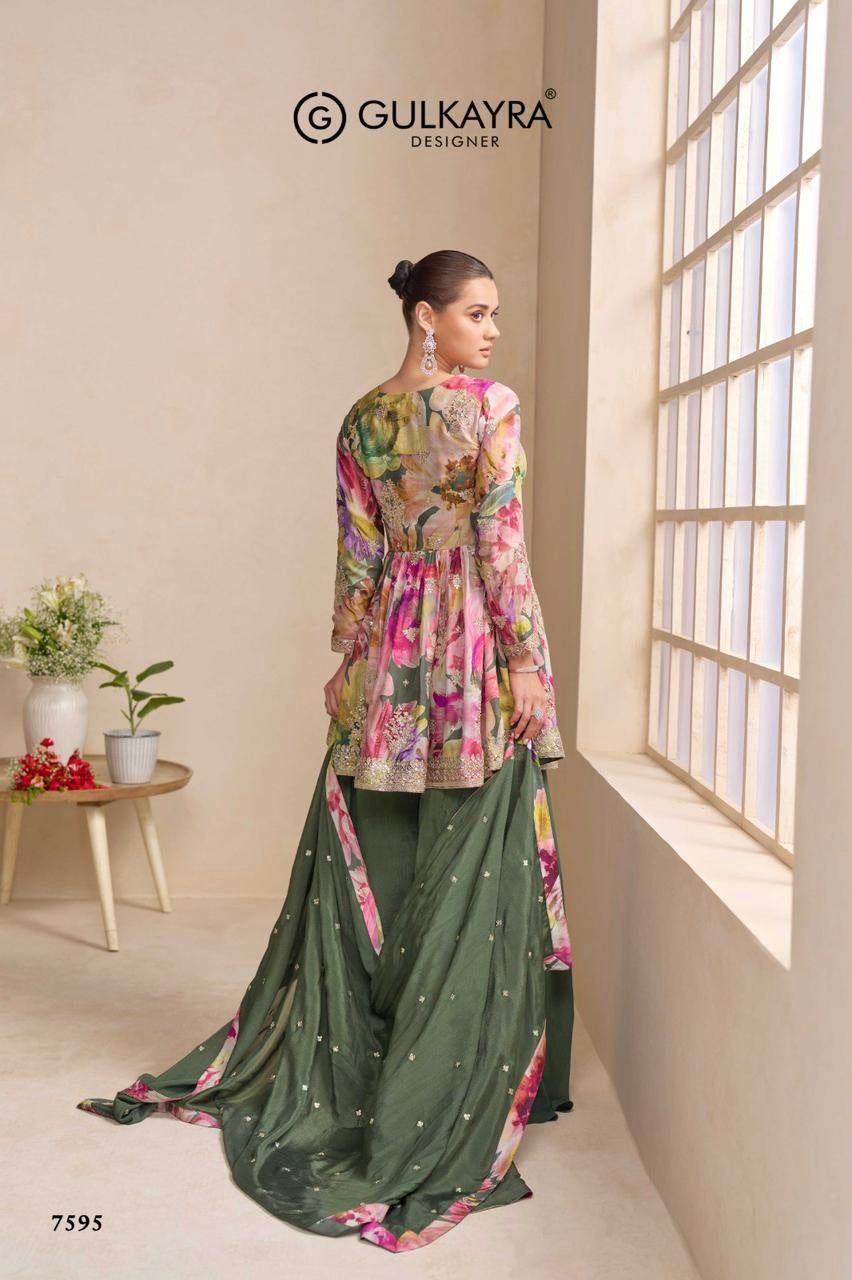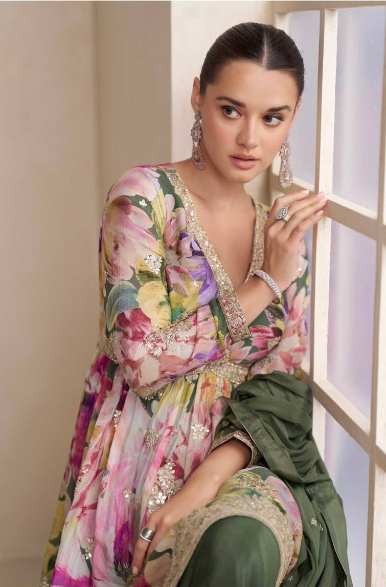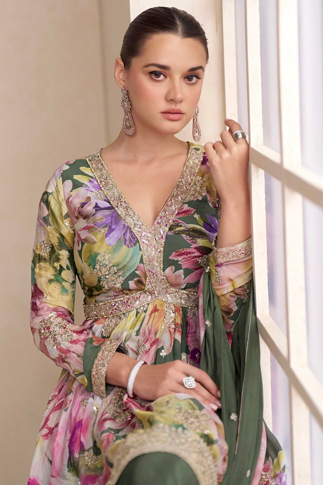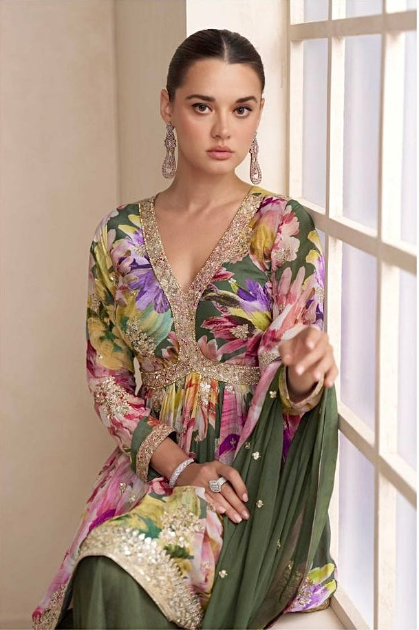 PRE-ORDER ITEM - DELIVERY TIME IS 2-3 WEEKS Ready to wear - Saree style gown with a jacket in pure Georgette fabric with heavy embroidery. Designed as free size – can be easily altered to fit your measurements. Maximum chest width is 42”