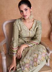 PRE ORDER- DELIVERY TIME IS 2-3 WEEKS Fully stitched top and trousers in sizes 42 and 44. Chinon fabric with thread and zari work with stonework.