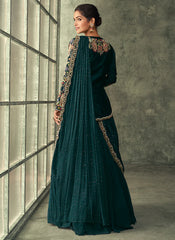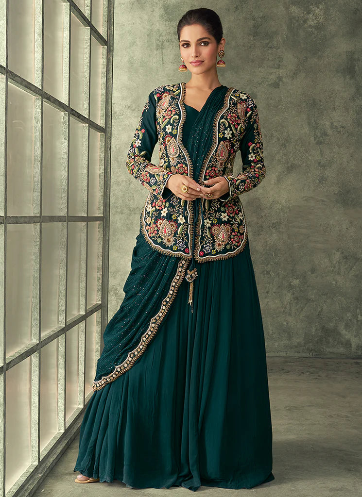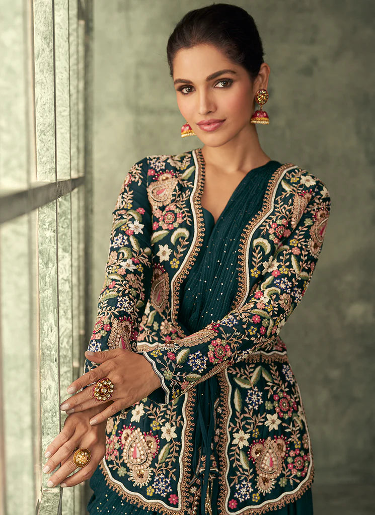PRE-ORDER ITEM - DELIVERY TIME IS 2-3 WEEKS Ready to wear - Saree style gown with a jacket in pure Georgette fabric with heavy embroidery. Designed as free size – can be easily altered to fit your measurements. Maximum chest width is 42”