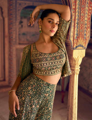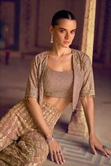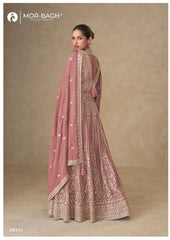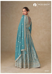 PRE ORDER- DELIVERY TIME IS 2-3 WEEKS Fully stitched anarkali and lehenga in silk chinon fabric with embellishment in size 44/XXL (approximately equivalent to an English dress size 18). Silk-chinon dupatta