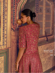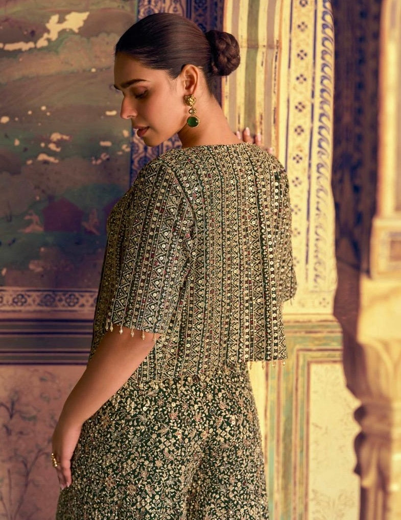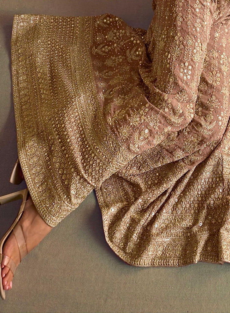 PRE-ORDER ITEM - DELIVERY TIME IS 2-3 WEEKS Ready to wear - 3 piece outfit in pure Georgette fabric with heavy embroidery. Designed as free size – can be easily altered to fit your measurements. Maximum chest width is 42”