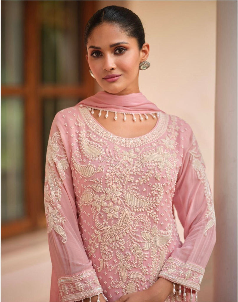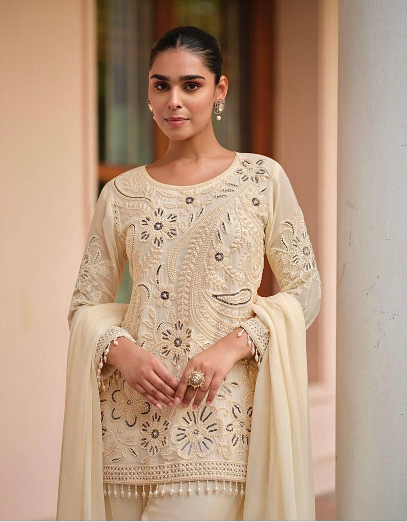 PRE-ORDER ITEM - DELIVERY TIME IS 2-3 WEEKS Ready to wear - 3 piece outfit in pure Georgette fabric with heavy embroidery. Designed as free size – can be easily altered to fit your measurements. Maximum chest width is 42”