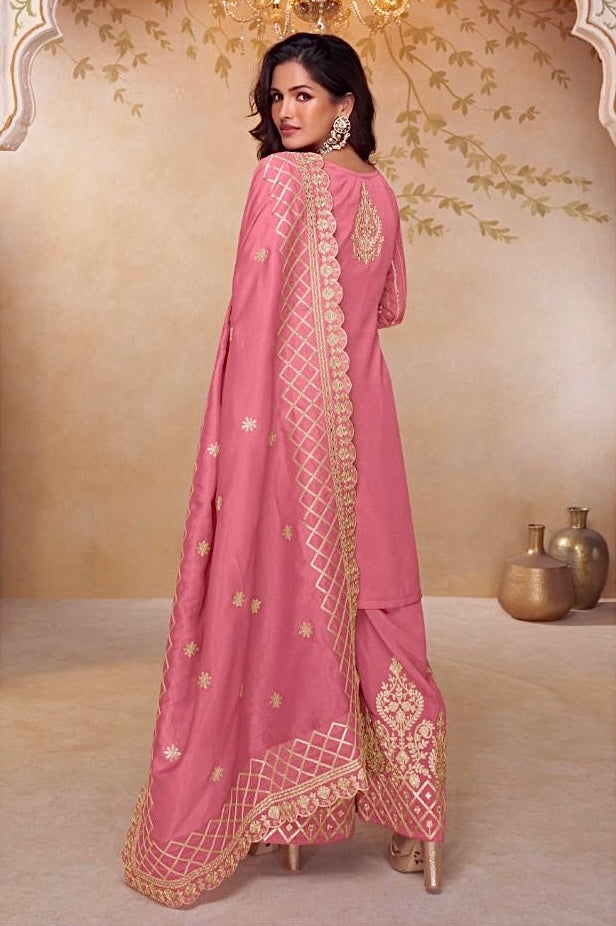 PRE ORDER- DELIVERY TIME IS 2-3 WEEKS Fully stitched top and trousers in sizes 40, 42 and 44. Chinon fabric with thread and zari work with stonework. Georgette dupatta